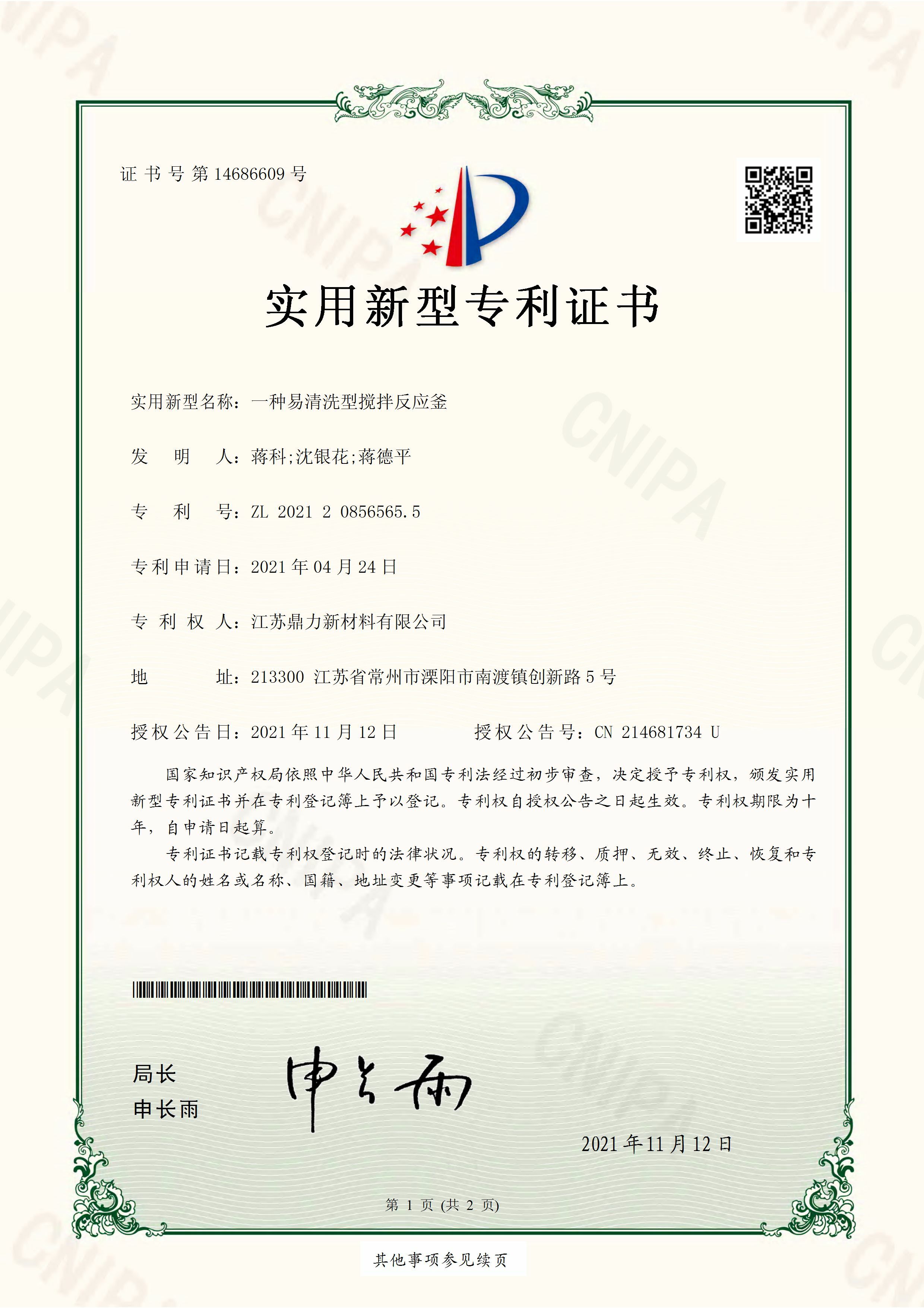 江苏鼎力荣获一种易清洗型搅拌反应釜实用新型